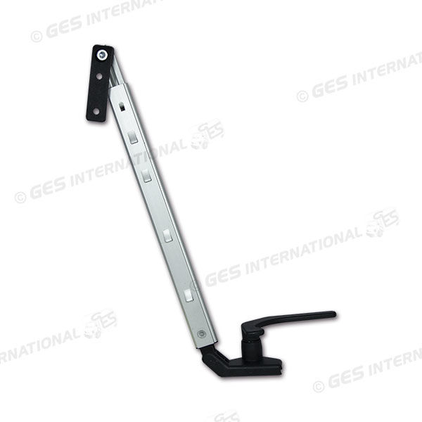Braccetto sinistro a 4 scatti, con maniglia e attacco a slitta Polifix, altezza di 450-500 mm e lunghezza di 230 mm da chiuso (solo parte in metallo).Adatto a finestre a compasso modelli Polyplastic F20/F23/F24/F25/F26/F28/F30/F33/F40.Attacco Polyfix a slitta.