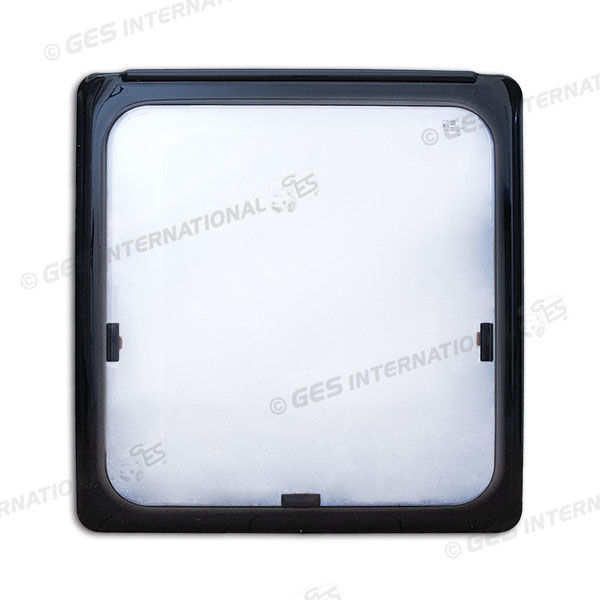 Finestra Plastoform FAD, con serigrafia grigia e bordo nero.Dimensioni di 520 x 550 mm.Colore blu zaffiro (RAL5003).