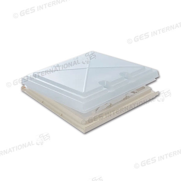 Oblò piccolo MPK, modello 42, dimensioni di 400 x 400 mm.Vetro smerigliato in polipropilene. Zanzariera ribaltabile che protegge dagli insetti e lascia entrare la luce e l'aria all'interno del mezzo.Colore beige.