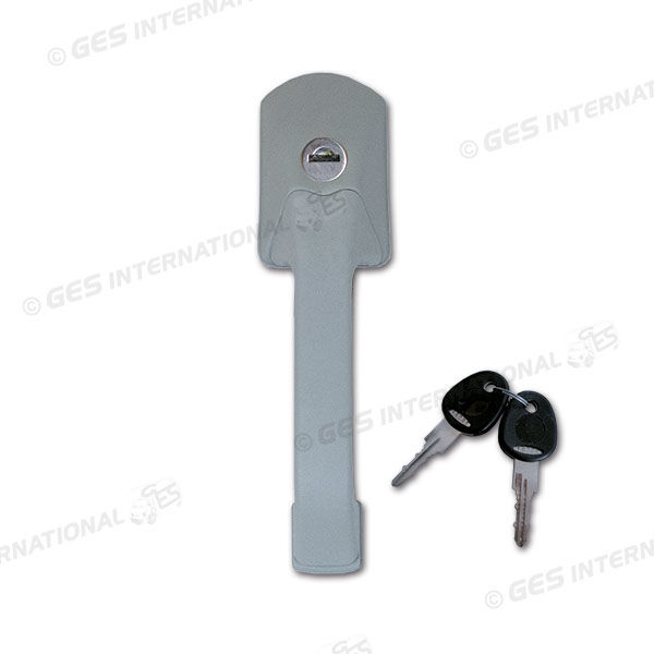 Serratura esterna 1060 per porte motorcaravan, con chiavi e cilindretto New system.Colore grigio.Serrature interne compatibili: serie 1059, SRT1118PI, SRT1075PI.