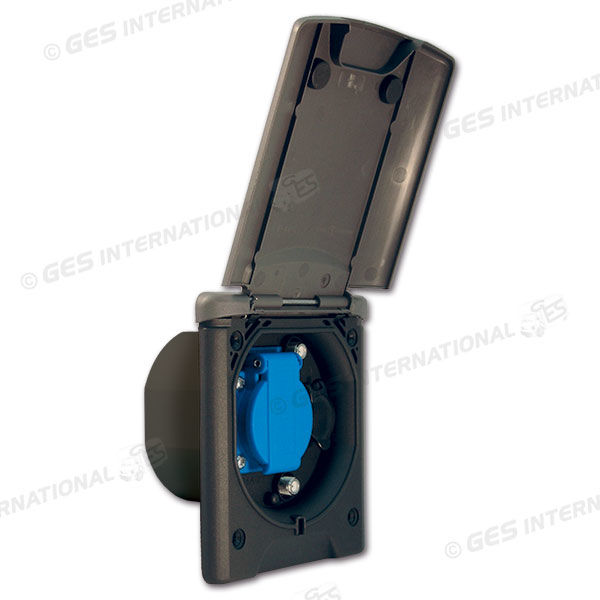 Presa esterna multifunzionale grigia, dotata di presa Schuko con sportellino, presa DIN e presa TV, presa SAT.Con coperchio e ribalta con magneti.