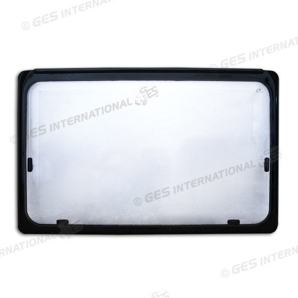 Finestra Plastoform FAD, con serigrafia grigia e bordo nero.Dimensioni di 900 x 550 mm.Colore blu zaffiro (RAL5003).