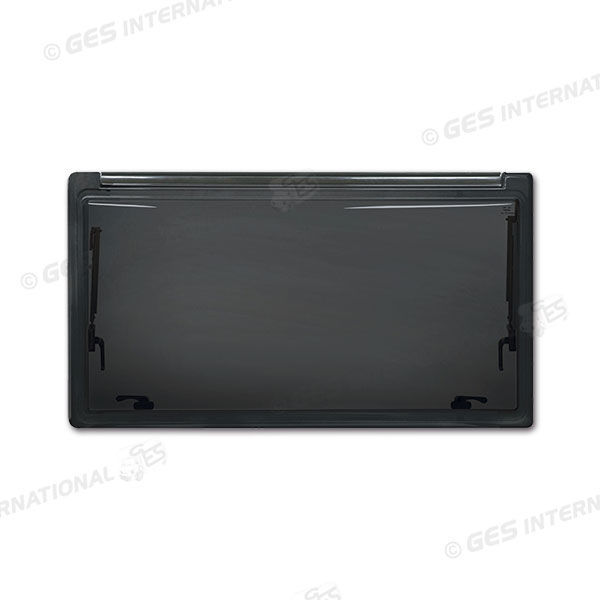 Finestra a compasso Plastoform FAN con doppio vetro acrilico fumé, senza serigrafia e con profilo in nylon.Dimensioni: 1000 x 500 mm.Colore nero fumé.