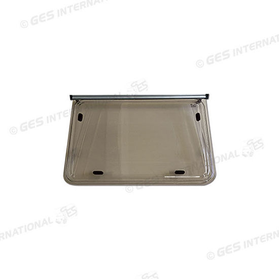 Finestra in polibicarbonato con camera d'aria, realizzata con i due angoli inferiori arrotondati e i due superiori ad angolo retto.La cerniera in alluminio è montata all'interno della parte superiore, completa di braccetti e maniglie.Fornita di controcerniera da montare sul mezzo, per renderla intercambiabile con altri modelli di finestra.Dimensioni: 800 x 400 mm.Colore marrone.