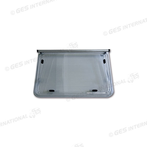 Finestra in polibicarbonato con camera d'aria, realizzata con i due angoli inferiori arrotondati e i due superiori ad angolo retto.La cerniera in alluminio è montata all'interno della parte superiore, completa di braccetti e maniglie.Fornita di controcerniera da montare sul mezzo, per renderla intercambiabile con altri modelli di finestra.Dimensioni: 900 x 840 mm.Colore grigia.