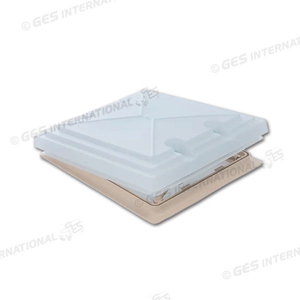 Oblò piccolo MPK, modello 32, dimensioni di 320 x 360 mm.Vetro smerigliato in polipropilene. Zanzariera ribaltabile che protegge dagli insetti e lascia entrare la luce e l'aria all'interno del mezzo.Colore beige.