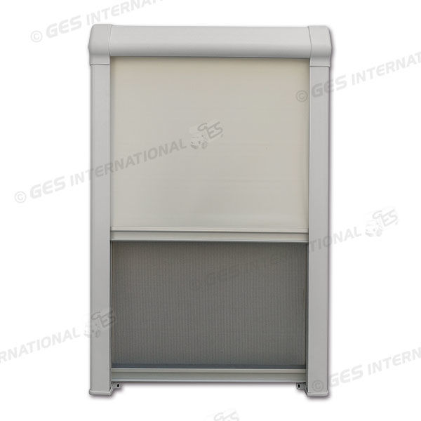 Il telo oscurante e il telo zanzariera sono racchiusi all’interno dello stesso cassonetto e scorrono dall’alto verso il basso, eliminando qualsiasi ingombro alla base della struttura.È possibile azionare i due teli separatamente e bloccarli in posizioni intermedie in punti predefiniti sui montanti laterali.A cassetta singola.Dimensioni: 450 x 650 mm.Colore grigio.