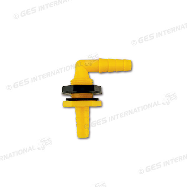 Passa‑acqua per serbatoi Ø 10/12 a 90° Ideale per acqua potabile e perfetto per il prelievo da taniche o serbatoi, soprattutto in abbinamento a pompe sommerse. Dotato di controdado e guarnizione per un fissaggio sicuro, è realizzato in PP LM T101, resistente fino a 120 °C per brevi periodi e 85 °C in uso continuo, con una pressione massima di 7 bar.