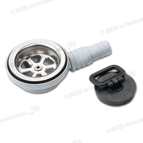 Piletta a gomito di 90°Con portagomma e tappo. Per lavelli in acciaio con uscite sia da Ø 20 mm che da Ø 25 mm
