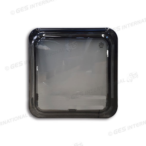 Finestra a compasso Roxite 4.24, con doppio vetro acrilico grigio, serigrafia nera e profilo nero.Misura foro scocca: 1300 x 550 mmMisura lastra: 1384 x 638 mm